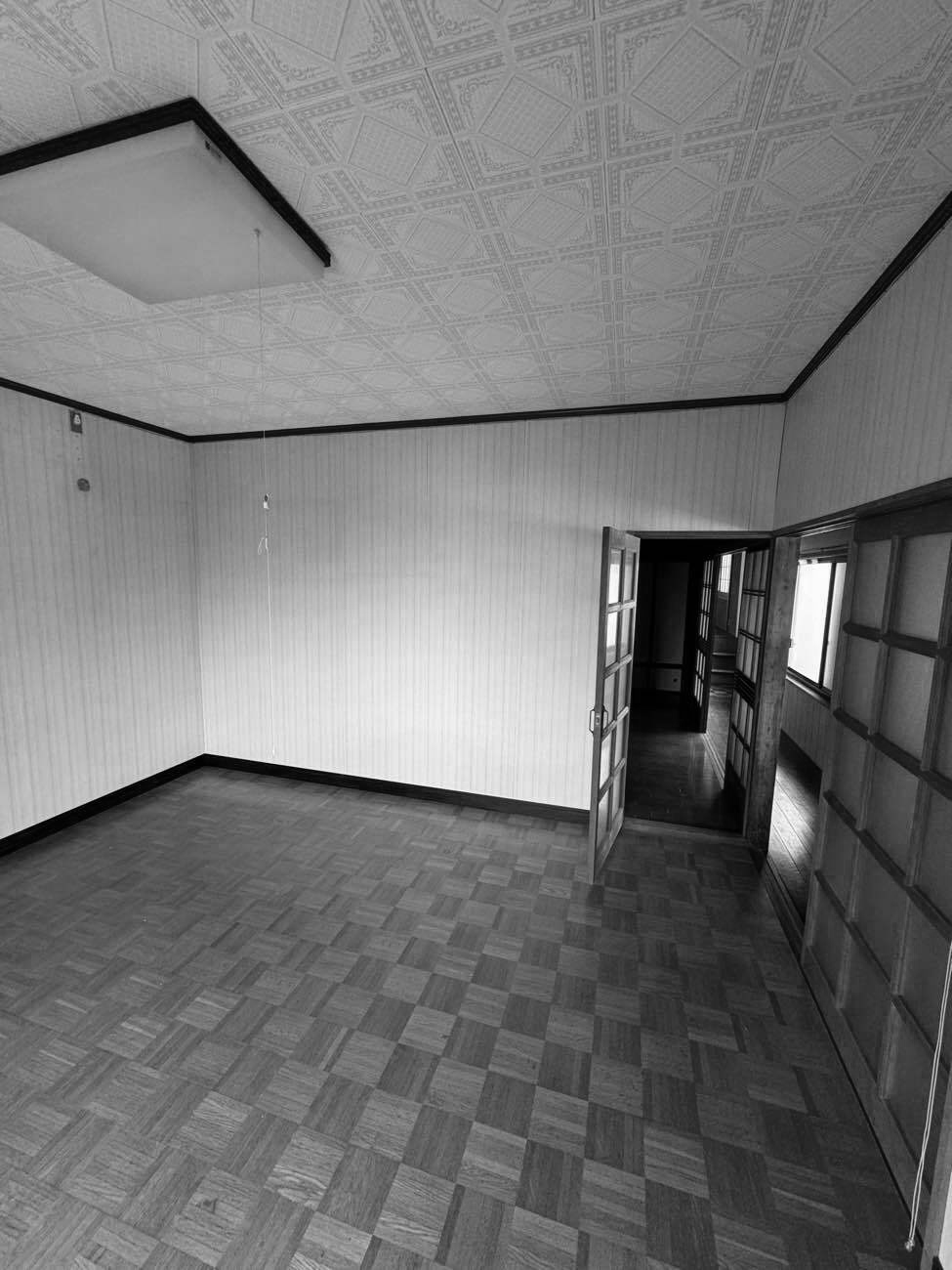 吹抜に面する壁。もともと二間続きだった和室の間境のため、既存の欄間、建具の内法を再利用している。